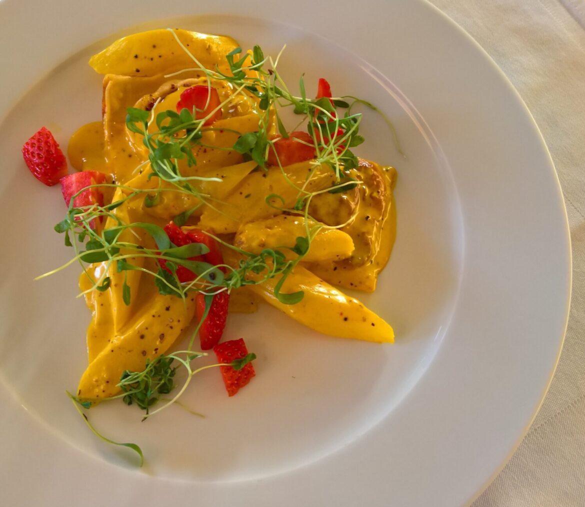 Die goldgelb angebratenen Ravioli auf den vorgewärmten Pastatellern anrichten, die Safransauce mit dem Spargel darüber geben, Erdbeerscheiben darauf verteilen und zum Schluss mit etwas Kresse dekorieren. Das Geschmackserlebnis ist ein absolutes Highlight! Der Safran in Verbindung mit der Bärlauchfüllung, den Erdbeeren und der Kresse: einfach genial!